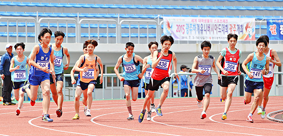 제9회 전국장애학생체육대회 첫날인 19일 제주종합경기장에서 열린 남고부 육상 1500m에 참가한 선수들이 힘차게 출발선을 나서고 있다.