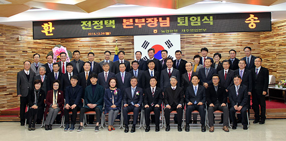 NH농협은행 제주본부(본부장 전정택)는 26일 제주본부 4층 대회의실에서 가족과 직원 등 100여명이 참석한 가운데 전정택 본부장의 퇴임식을 개최했다.