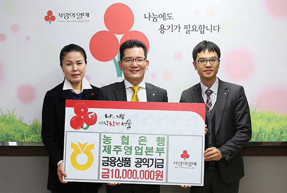 NH농협은행 제주영업본부는 28일 금융상품 공익기금 1000만원을 제주사회복지공동모금회에 기탁했다. 공익기금은 겨울을 맞아 따뜻한 도움이 필요한 홀몸노인과 소외계층에 김장김치, 생활용품 지원 등에 사용될 계획이다.