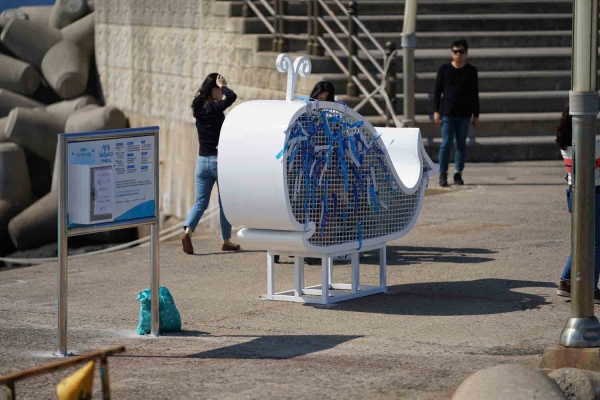 조형물은 해양 쓰레기로 고통받는 고래(해양 동물들)의 아픔을 형상화 한 것으로, 모두의 관심과 노력으로 고래에게 푸른 바다를 되돌려주자는 의미로 푸른색 리본을 묶는 이벤트를 진행 하고 있다.