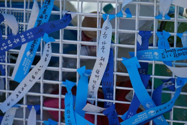 이벤트 참가자들은 리본에 깨끗한 바다를 염원하는 마음을 적고 조형물에 매단 사진을 찍어 인스타그램에 인증샷을 올리면 된다. #제주매일 #제주특별자치도 #제주바당 #쓰레기분리배출 #고래에게푸른바다를 #바다를업사이클링하다 #일회용품줄이기 등의 해시태그를 남긴 뒤, 제주바당 계정을 팔로우하고 이벤트 페이지에 ‘참여완료’ 댓글을 남기면 된다.