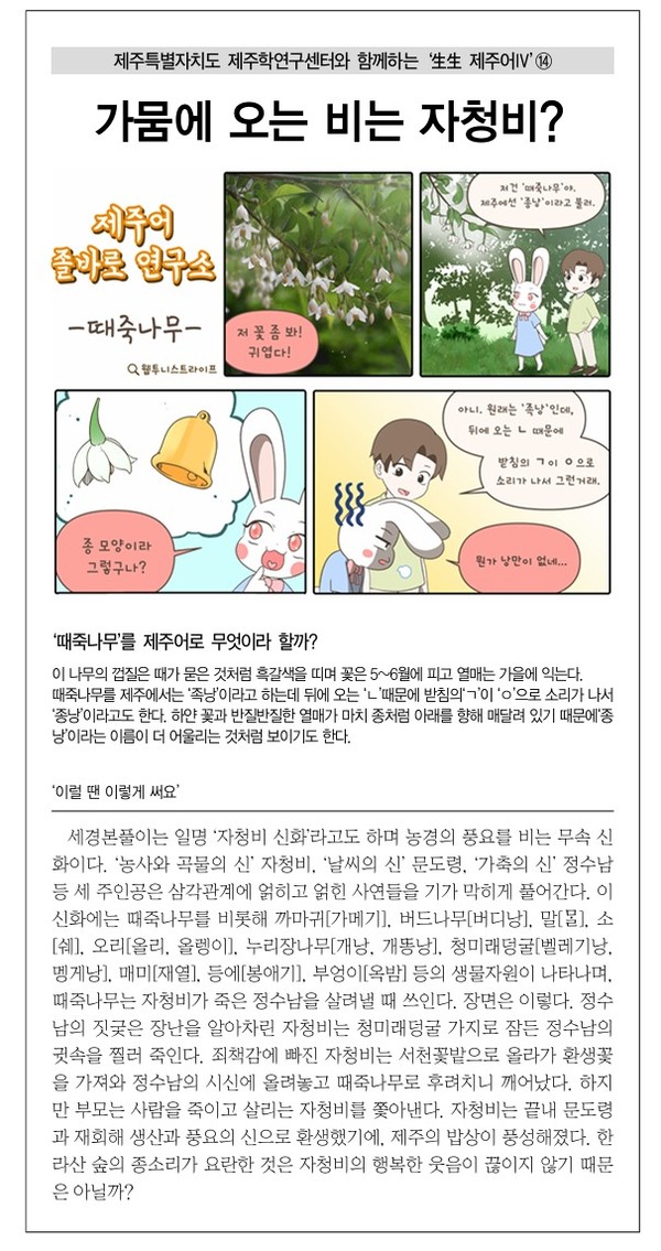 제주특별자치도 제주학연구센터와 함께하는 ‘生生 제주어Ⅳ’ (14)때죽나무 제주매일 news@jejumaeil.net 다른기사 보기 저작권자 © 제주매일 무단전재 및 재배포 금지 딥페이크등(영상‧음향‧이미지)을 이용한 선거운동 및 후보자 등에 대한 허위사실공표‧비방은 공직선거법에 위반되므로 유의하시기 바랍니다.(삭제 또는 고발될 수 있음) 개의 댓글 회원로그인 작성자 비밀번호 댓글 내용입력 댓글 정렬 최신순 추천순 답글순 BEST댓글 BEST 댓글 답글과 추천수를 합산하여 자동으로 노출됩니다. 닫기 더보기 댓글삭제 삭제한 댓글은 다시 복구할 수 없습니다. 그래도 삭제하시겠습니까? 비밀번호 닫기 댓글수정 댓글 수정은 작성 후 1분내에만 가능합니다. 본문 / 400 비밀번호 닫기 내 댓글 모음 닫기