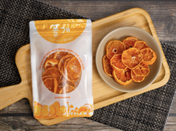 제주 감귤을 그대로 건조한 감귤칩과 바삭한 과즐을 결합해 인공첨가물 없이 고소함과 상큼함을 살린 프리미엄 간식을 내놓고 있다.