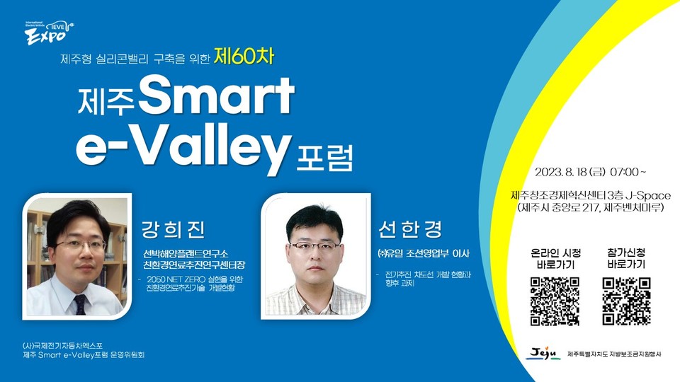 (사)국제e-모빌리티엑스포는 오는 18일 오전 7시 제주시내 제주창조경제혁신센터 J-스페이스에서 ‘제60차 제주 Smart e-Valley 포럼’을 개최한다.